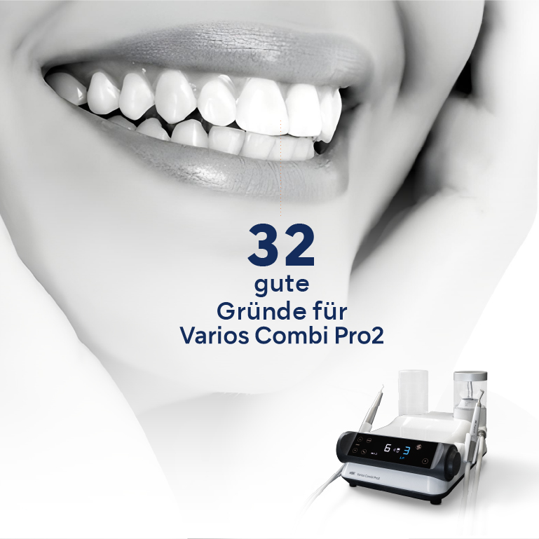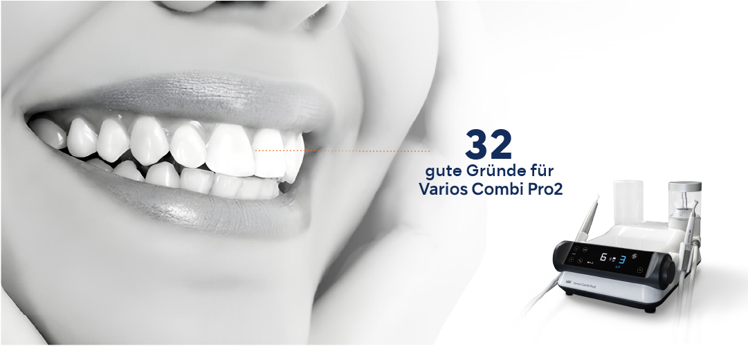 Varios Combi Pro2 hat den Anspruch, bei höchster Benutzerfreundlichkeit sowohl sub- und supragingivale Pulverstrahlbehandlung als auch Ultraschall-Anwendungen zu vereinen und Ihnen gleichzeitig alle Freiheiten für Ihre persönliche Arbeitsweise sowie die Bedürfnisse und therapeutischen Erfordernisse Ihrer Patienten zu gewähren.