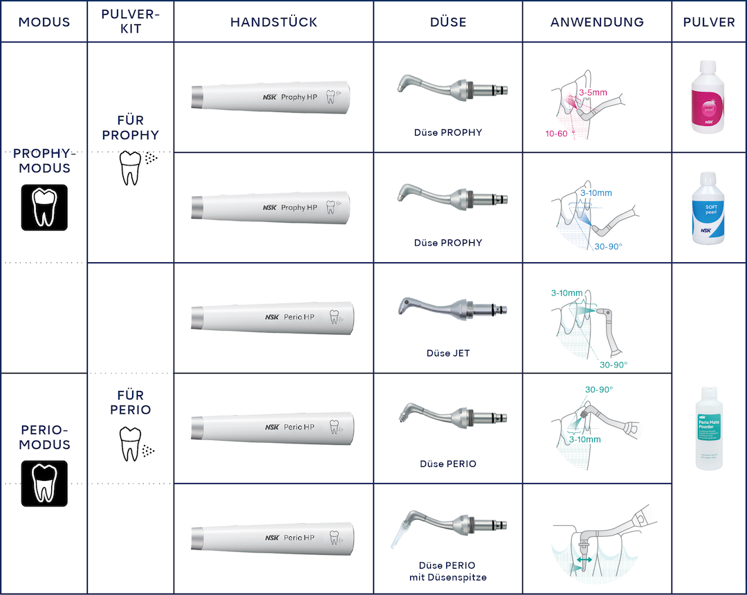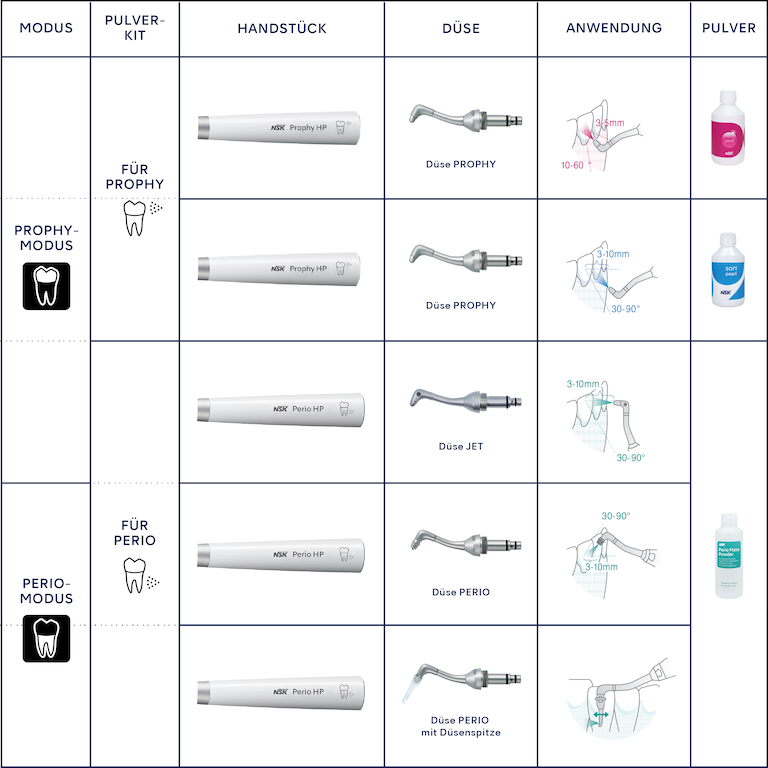 Als Antwort auf die Anforderungen von Behandlern wurde mit der „Jet-Düse“ eine zusätzliche Düse für das Perio-Handstück entwickelt – für den Einsatz in gingivalen und supragingivalen Behandlungen. Als Ergänzung zur bisherigen Perio-Düse ermöglicht diese Jet-Düse eine noch präzisere Ausrichtung auf den gewünschten Behandlungsbereich. Diese beiden Arten von Perio-Düsen sind in Abhängigkeit der vorgesehenen Anwendung untereinander austauschbar.