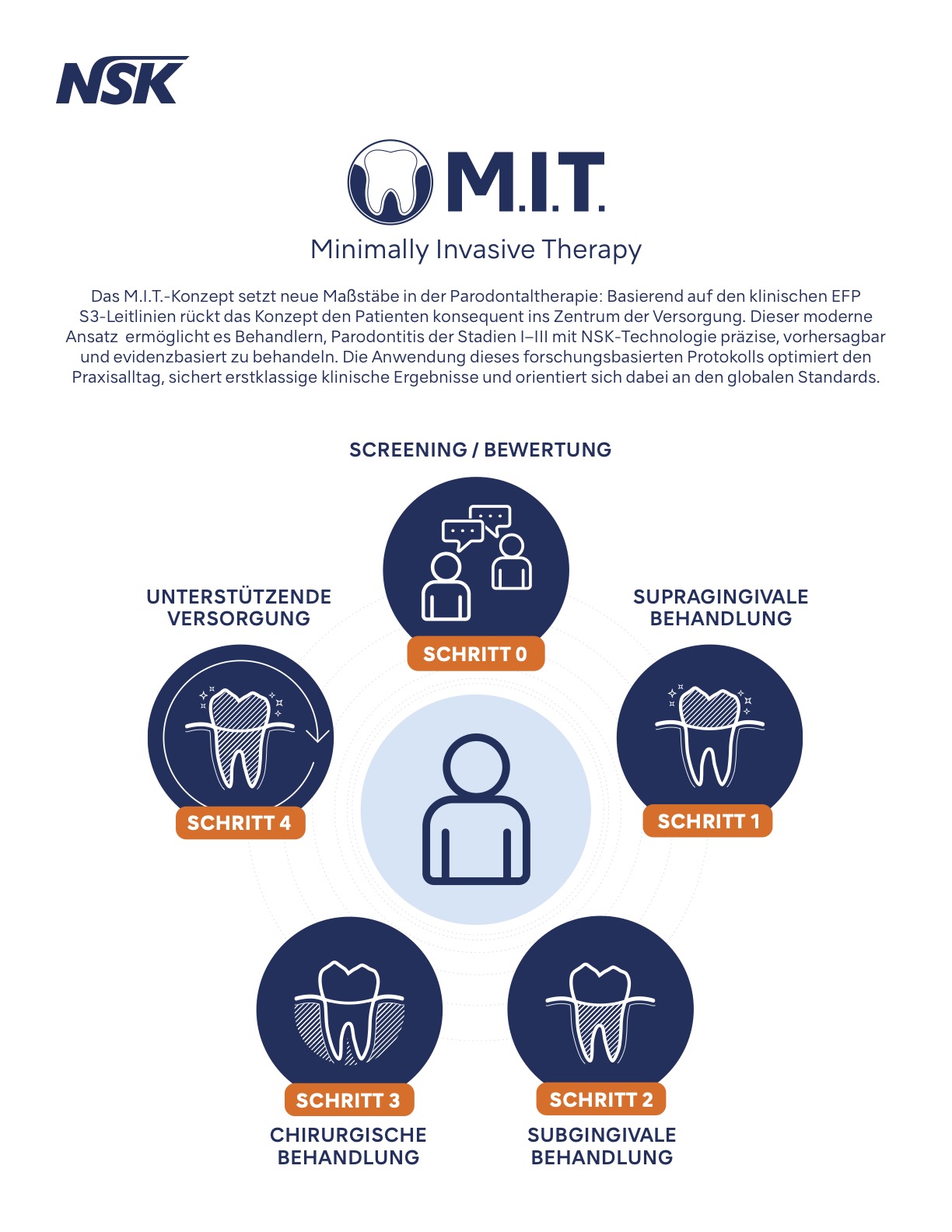 Zur Unterstützung dieses globalen Standards hat NSK das M.I.T.-Konzept entwickelt. Das M.I.T.-Konzept bietet sowohl Produkte zur Unterstützung der Parodontitisbehandlung als auch Möglichkeiten zum Lernen und Forschen im Bereich der Parodontalpflege.